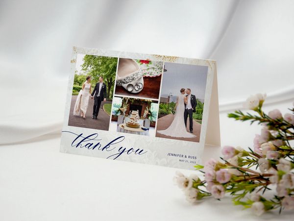 Including your photo is the best way to say "Thank you" to your guests. They can also be simple or intricate depending on your style. We can score a folded card, write messages on the front, back or inside and leave room for a hand-written note from you.